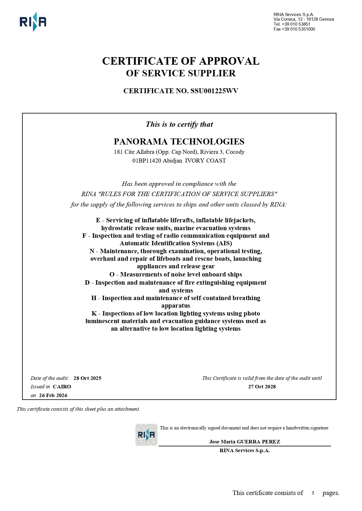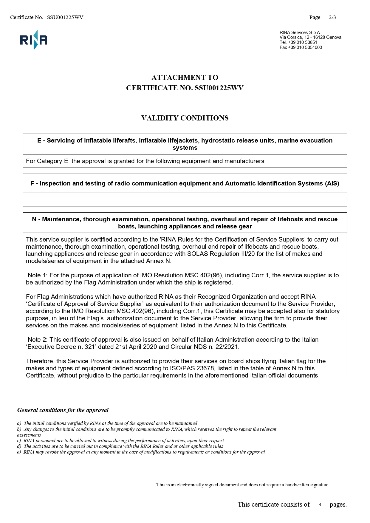 RINA Class - Certificate of Approval for Service Supplier