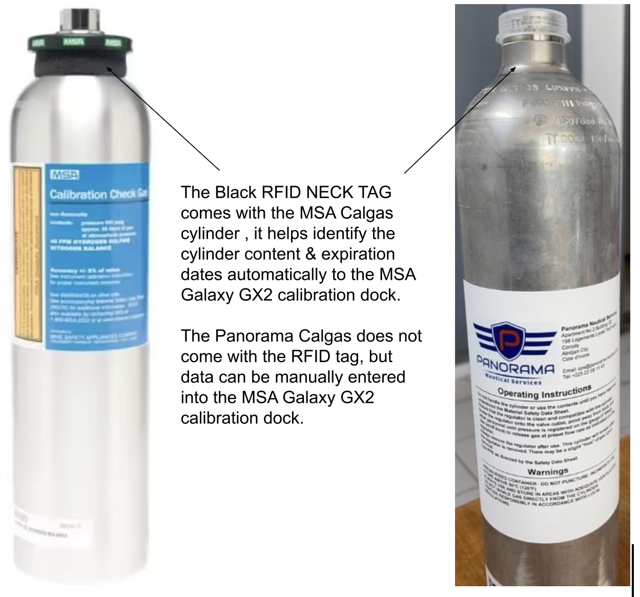 2. MSA version w/RFID neck tag - this is the standard cylinder with MSA configuration + it has an MSA RFID tag which automatically configures its data to the MSA GX2 station.
